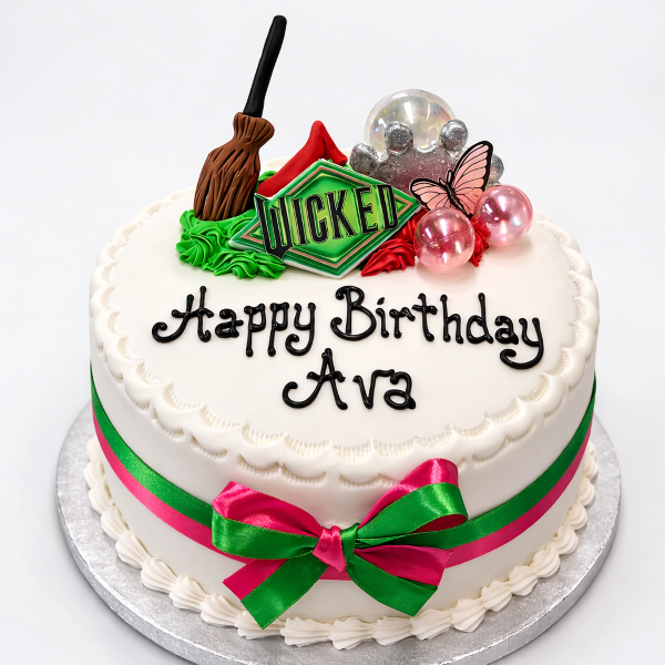 Make birthdays truly magical with this stunning Wicked-inspired celebration cake, designed to bring a touch of theatre and enchantment to your special occasion. This elegant 9-inch round cake is beautifully finished with smooth white fondant and decorated with vibrant emerald green and pink ribbon detailing, inspired by the iconic colours of the beloved musical.Perfect for birthdays, theatre lovers, or anyone who enjoys a little magic, this cake not only looks spectacular but also serves approximately 25–30 guests, making it ideal for parties and gatherings.